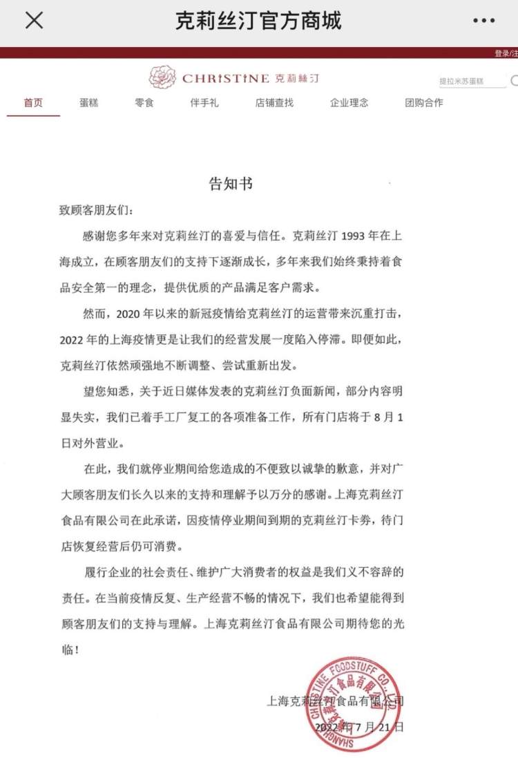 告知书称感谢消费者多年来对克莉丝汀的喜爱与信任。“2020年以来的新冠疫情给克莉丝汀的运营带来沉重打击,2022年的上海疫情更是让我们的经营发展一度陷入停滞。即便如此,克莉丝汀依然顽强地不断调整、尝试重新出发。”