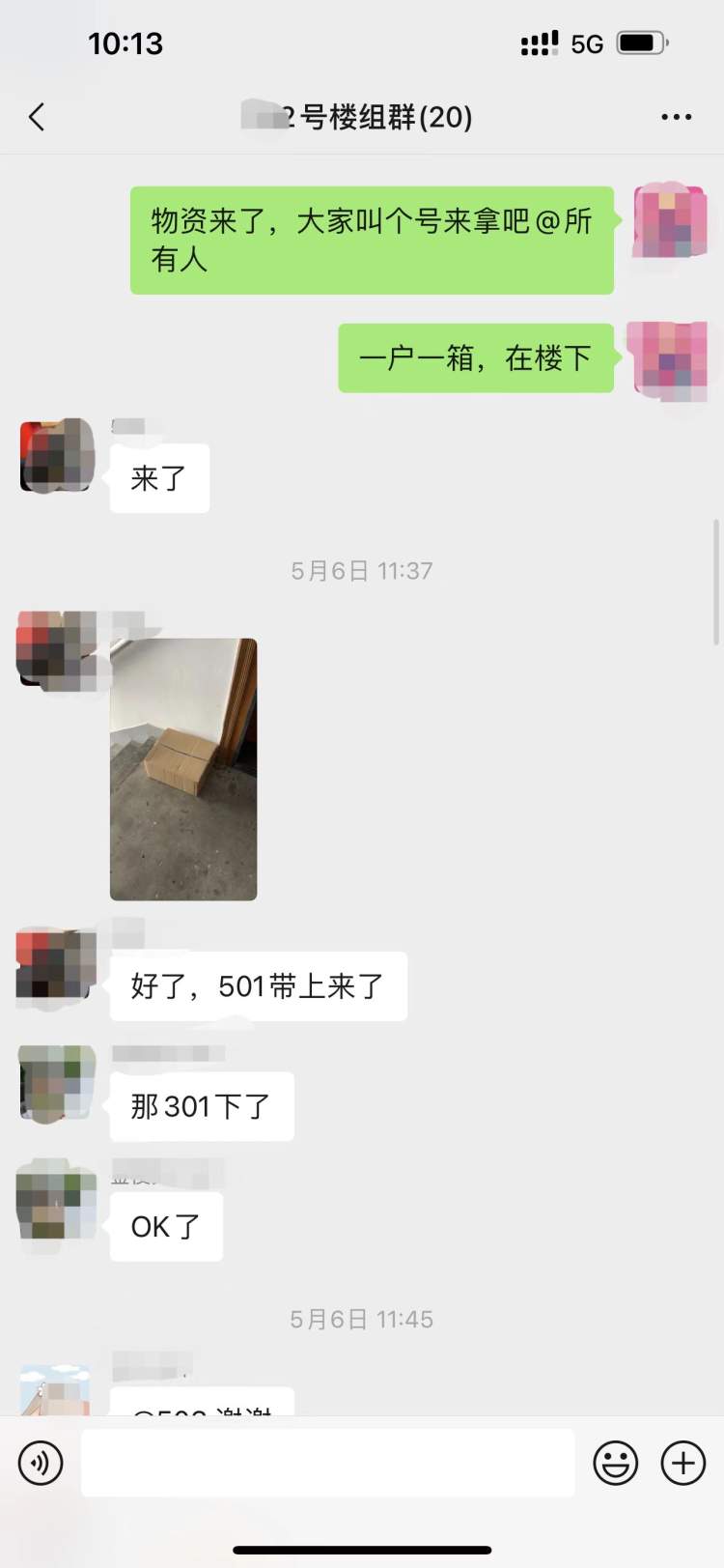 白玉一委的居民们同样互帮互助、共渡难关。为了解决居民们收取物资和快递的难题,小区成立“物资摆渡人”小分队,他们会将物资或快递送至楼下后,拍照分享至微信群,随后由楼组长继续“接棒”,根据室号进行喊号,居民挨家挨户去取,避免人多拥挤,做到无接触配送。