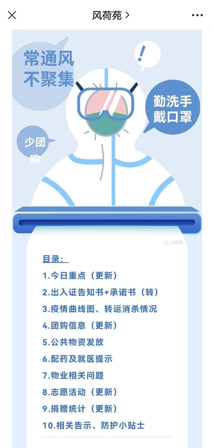 公开透明的居务全过程让居民群众们“尽收眼底”,大家纷纷表示:“如此一来,我们对疫情态势、防控事务,明白了、清楚了,对党和政府的坚强防疫措施就更信服了,我们的凝聚力更强了。”与此同时,一份份内容丰富、图文并茂的电子抗疫简报也应运而生。风荷苑抗疫日报涵盖十个方面的内容,团购信息和公共物资发放让多次投诉的居民得到满意的答案;华师大一村防疫简报中居民以漫画“白甲战士”展现志愿者风采;紫御豪庭抗疫日报,及时发布疫情动态,也让居民共同参与监督……