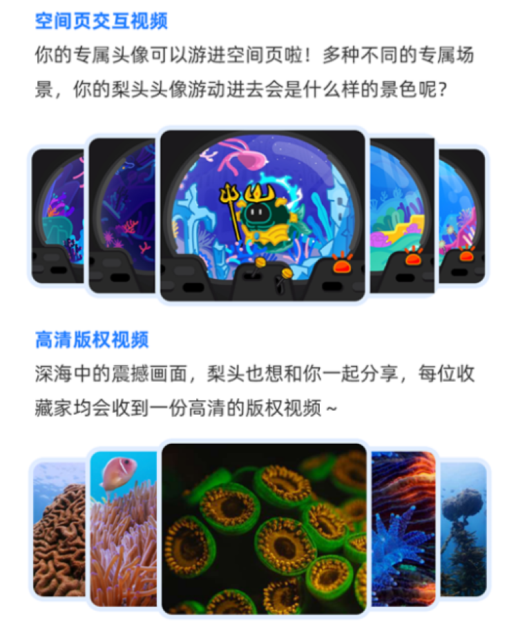 为纪念这期节目,本次数字藏品以海洋探秘为主题,主角亿点点小人“梨头”化身为潜水员、水手、探险家、神话人物等角色,以数字头像形式发放给收藏用户,还可融入随藏品附赠的空间页交互视频,在视频中游动起来,将用户的B站个人空间变为海底世界,充满乐趣。