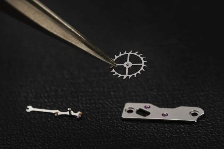 而且,为了减小厚度,获得专利的超薄发条盒配备极细游丝,而擒纵结构因此必须全部重新设计。取消了摆轮小板和叉头钉(护销),这两种零部件在摆轮自由运动过程中可防止机芯零件滑脱。同样获得专利的全新超薄擒纵结构,使用具有新型叉口的加长擒纵叉,取代了这些传统上为了“防翻转”的零件。此外,腕表设计中取消了传统机芯中快慢针调节系统,而是采用钛合金材质的可变惯性摆轮,同时配备6枚可对调速机构进行微调校准的砝码,来精准地调节机芯运行的快慢。