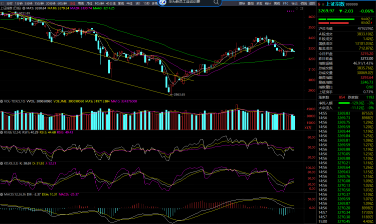 今天,沪深两市小幅高开,盘中生物质能发电板块走强,城发环境、东江环保涨停,韶能股份、富春环保、江苏新能、物产环能、中闽能源等跟涨;电力板块拉升,西昌电力、东旭蓝天封板,韶能股份、赣能股份、甘肃电投、建投能源等冲高。午后,汽车、游戏、小家电板块震荡走低。最后,沪市收于3269.97点,下跌0.06%;创业板指收于2737.31点,下跌0.51%。两市全天成交额9414亿元。