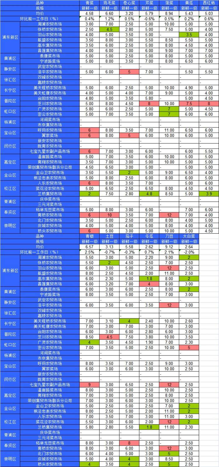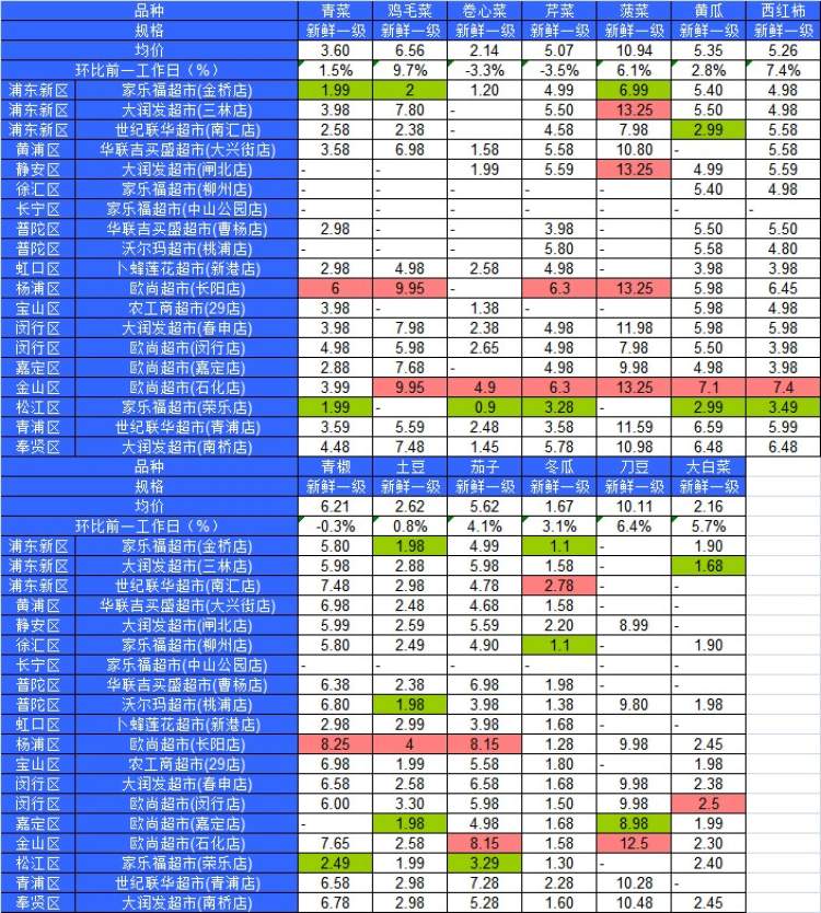 ■粉底标注代表该蔬菜品种在上述农贸市场或超市的最高价;绿底标注代表该蔬菜品种在上述农贸市场或超市的最低价