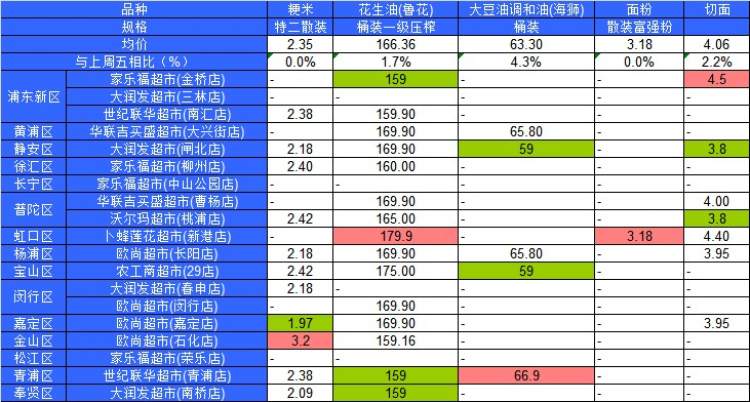 ■粉底标注代表该粮油品种在上述超市的最高价;绿底标注代表该粮油品种在上述超市的最低价