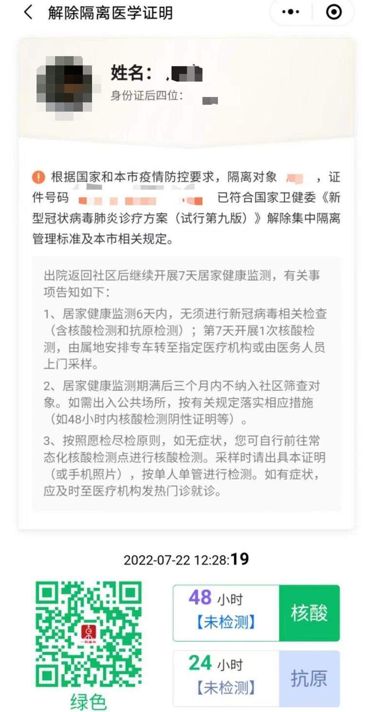 随后,他发来了今天(7月22日)的“解除隔离医学证明”的截图,上面显示“隔离对象已符合国家卫健委《新型冠状病毒肺炎诊疗方案(试行第九版)》解除集中隔离管理标准及本市相关规定。”并告知了“出院返回社区后”的一些注意事项。