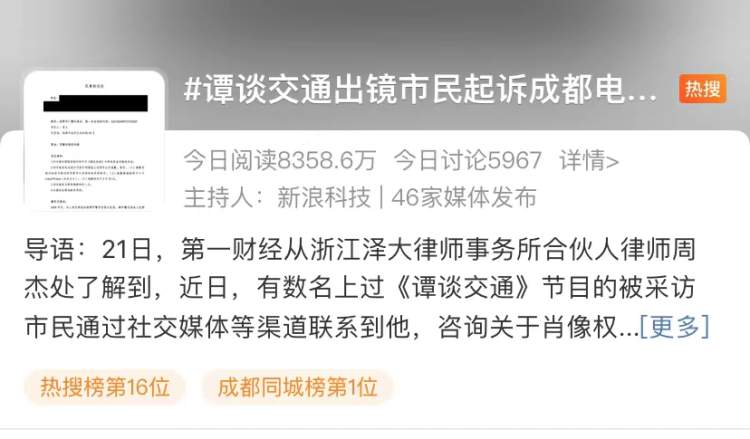一时间,#谭谈交通出镜市民起诉成都电视台#登上微博热搜。
