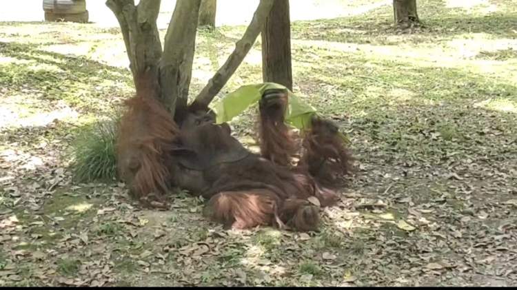 透过枝丫,斑驳的阳光撒在猩猩“庆庆”身上,远处瀑布带来混着水汽的阵阵凉风。“庆庆”拿着芭蕉叶躺在树下,撸串般享用着用凉水浸过的芭蕉叶。对于体型较小的“黑妞”来说,芭蕉叶可食用可遮阳可凹造型,是夏日出行的必备单品。