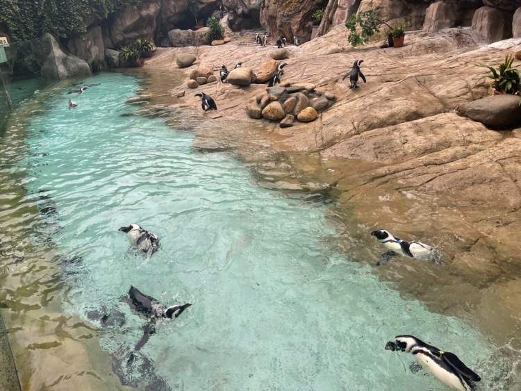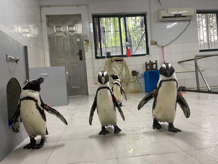 随着气温的上升,地面温度不断升高,到了上午10点左右,斑嘴环企鹅就会回到室内孵空调了,否则室外地面40°以上的高温会造成企鹅脚掌不适。