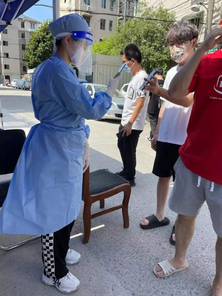 上海健康医学院大一的陈婷则在暑假来临之际毅然报名成为长二一委的一名防疫志愿者。她主要负责扫码和发放小区的出门证,有时也会负责帮采样员提前备好用品,提高采样效率。