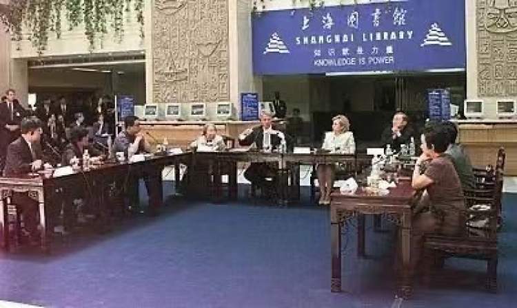 1998年6月30日,克林顿总统和夫人在上海访问期间,参观了中国最现代化的图书馆-——上海图书馆。