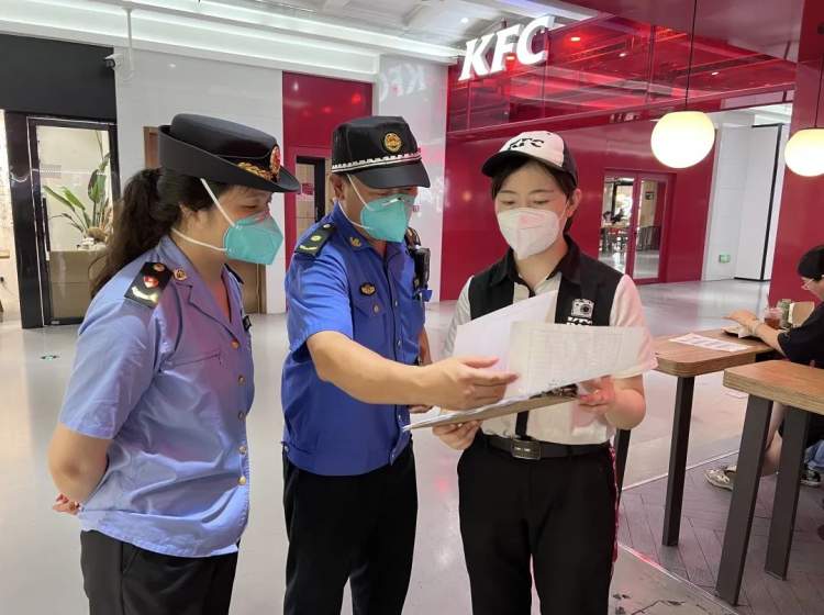 执法队员来到一家KFC店门前,首先通过后台数据查看了扫该店场所码的人数,并与该店当天的营业记录进行了比对。“如果营业记录与扫场所码人数出现了严重的不匹配,说明商家没有做到‘逢进必扫、逢扫必验、不漏一人’,我们会根据情节严重程度,对店家开具整改通知或闭店处罚等措施。”五角场街道商圈楼委会书记许之曦说道。随后,巡查执法队员还对店家当天的消杀台帐和店员的核酸检测记录一一进行了检查。