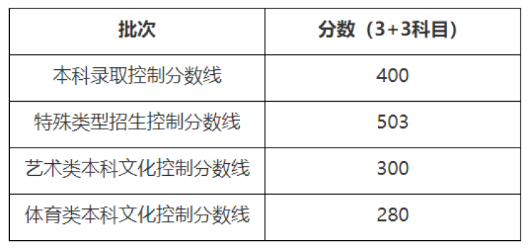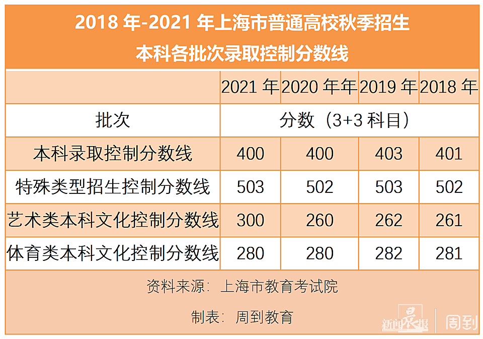快讯!2022年上海市普通高校秋季招生本科各批次录取控制分数线确定 徐斌忠 2022-7-23 来源:周到上海 2022年上海市普通高校秋季招生本科各批次录取控制分数线确定。其中,本科录取控分线为400分,特殊类型招生控分线为503分,均与去年相同。 本科录取控制分数线是按招生计划数与线上考生数的一定比例来划定的。 上海市教育考试院相关负责人介绍称,今年考生的高考成绩整体水平高于去年,其中高分考生人数较往年也有所增加,但同时在沪招生计划数相比往年也略有增加,从而使得今年的本科录取控制分数线仍与往年持平。 附:近年来上海本科各批次录取控分线 来源:周到上海 作者:徐斌忠 赞一个 (0)