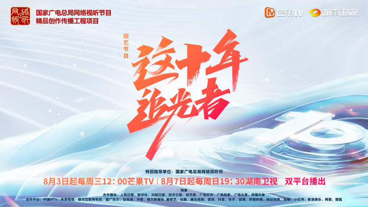 《这十年》微纪录片定档8月1日起每周一、周二10点播出,《这十年·追光者》综艺节目定档8月3日起每周三12点播出。届时,将在芒果TV、中国广电、中国IPTV、百视通、华数、爱奇艺、腾讯视频、网易等全网各大平台同步上线,湖南卫视也将于8月7日起每周日19点半播出《这十年·追光者》。