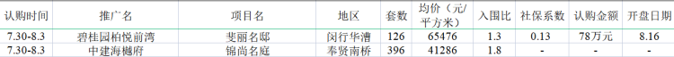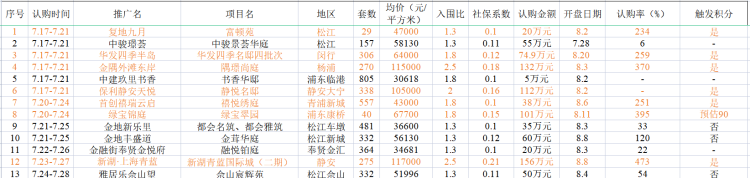 具体来看,松江【复地九月】、闵行【华发四季半岛】、杨浦【金隅外滩东岸】、静安【静安天悦】【新湖上海青蓝】、青浦【首创禧瑞云启】、浦东【绿宝锦庭】7盘均触发积分。