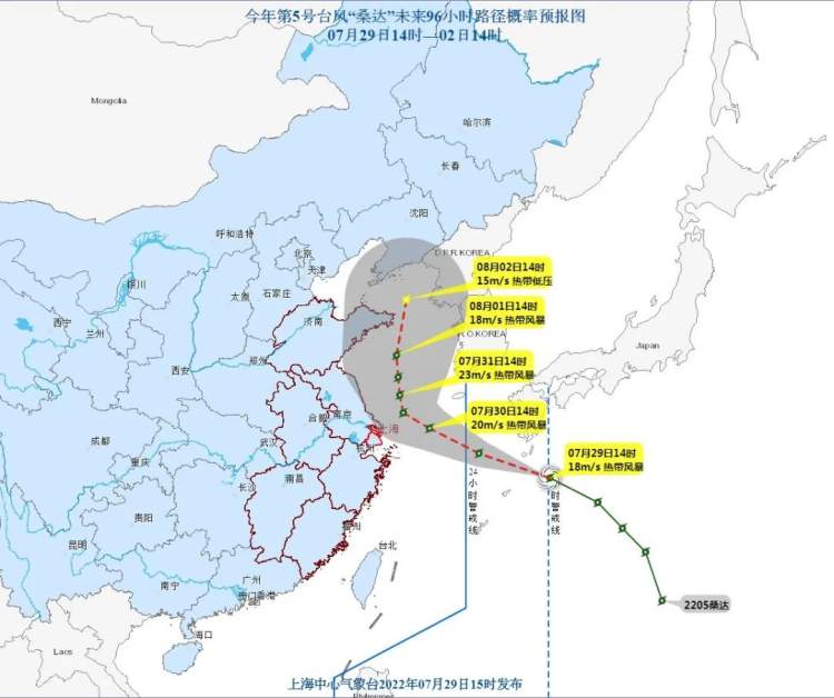 它将于今日夜间移入东海海域,本周六夜间到周日白天将在上海东部海域徘徊少动,周日夜间逐渐转向偏北方向移动,强度逐渐减弱,趋向朝鲜半岛。