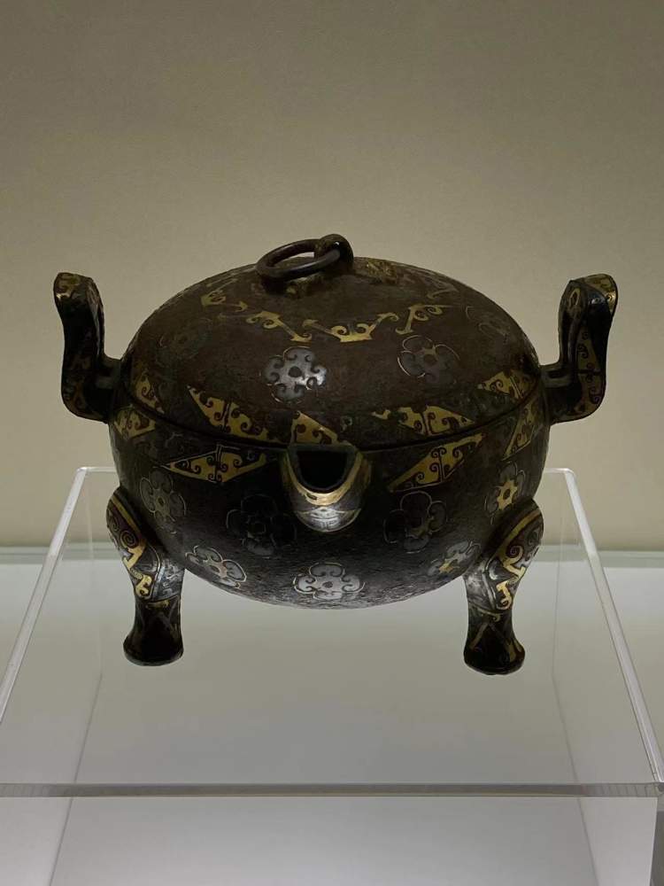 而战国晚期的镶嵌金银团花纹带流鼎,整体布局匀称和谐,纹样图案对称、工整,四瓣花纹非常罕见,铺首钮也很少见,给人以强烈的艺术感染力。