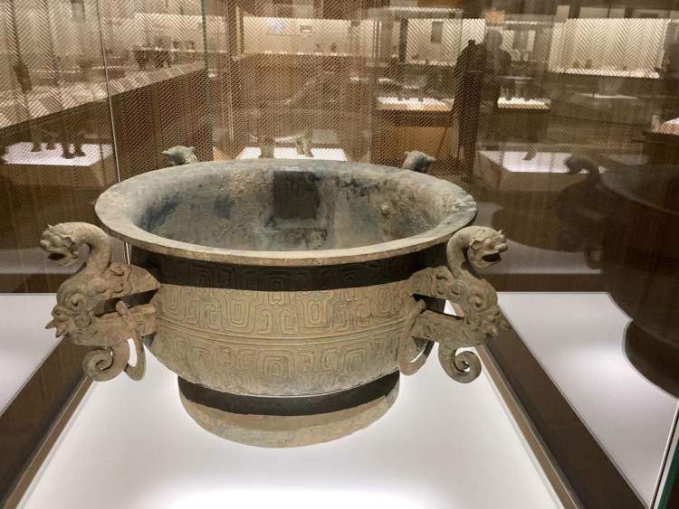 相比网格纹鼎,旁边商代晚期的妇好鼎在形制和纹饰上就有了较大变化,纹饰、工艺更加规整,兽面纹和蝉纹都十分瑰丽精美。