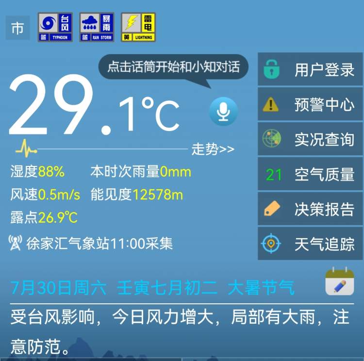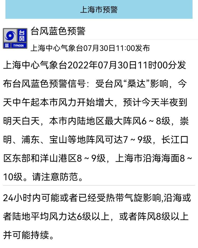 上海发布台风蓝色预警!目前台风、暴雨、雷电“两蓝一黄” 徐妍斐 2022-7-30 来源:周到上海 今年第5号台风“桑达”差不多来到了上海的同纬度。 上海中心气象台2022年07月30日11时00分发布台风蓝色预警信号: 受台风“桑达”影响,今天中午起本市风力开始增大,预计今天半夜到明天白天,本市内陆地区最大阵风6~8级,崇明、浦东、宝山等地阵风可达7~9级,长江口区东部和洋山港区8~9级,上海市沿海海面8~10级。请注意防范。 截至目前,申城“两蓝一黄”共三个预警。 来源:周到上海 作者:徐妍斐 赞一个 (0)