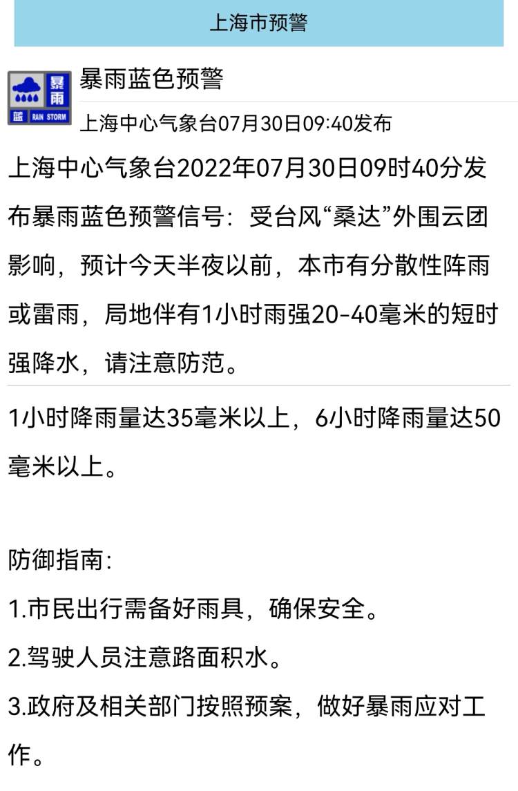上海中心气象台9时40分发布暴雨蓝色预警信号: