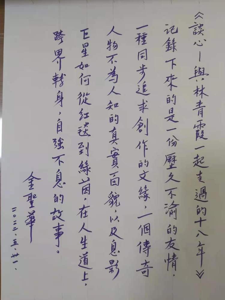 十八年来,两人相互扶持,相互勉励,在金圣华的引见之下,林青霞结交了许多文化界的好友,她向余光中、林文月、倪匡、张大春等虚心求教写作的诀窍,她们一起到北京拜访季羡林,向季大师讨文气,青霞由此写出了《完美的手》一文,写作生涯自此更进一步。