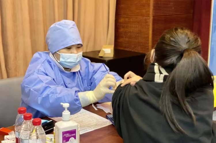 在居民区疫苗接种点,来自四平社区卫生服务中心疫苗接种专班的护士一边接种疫苗,一边嘱咐着打完针的注意事项。