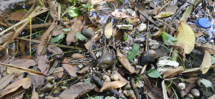 6月以来随着气温逐渐升高,横港河出现较多福寿螺和卵块,大小不一,形状与田螺相似,但颜色偏黄,有两对触角,底部稍平,主要附着于河堤边及水生植物上。经向专业人员咨询,福寿螺为恶性外来入侵物种之一,繁殖力极强,人类生食或半生食会感染寄生虫引发的相关疾病;能威胁本地物种生存,打破原有的生态平衡并对生态系统功能产生影响,已被列入国家“危害最大的外来物种”清单,既影响河道生态环境,也使得周边景观面貌受到影响。