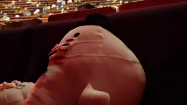 原来,出于防疫需要,文化广场7月复演以来也安排了观众席座位的间隔,但是不同于拉封条的“常规操作”,文化广场这次把封条变成了可爱的“大白”——让剧场的吉祥物大白鲸的玩偶来陪伴观众保持安全距离。这一萌操作不仅让观众“倍感温暖”,也打动了带着新作品来到文化广场的陈薪伊导演。