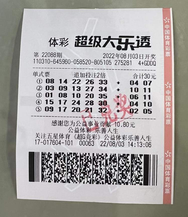8月3日晚,体彩超级大乐透第22088期开奖,本期全国共开出6注一等奖,上海中得4注,其中2注1596万元追加投注一等奖落入青浦。