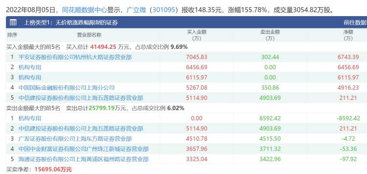 广立微是领先的集成电路EDA软件与晶圆级电性测试设备供应商,专注于芯片成品率提升和电性测试快速监控技术,是国内外多家大型集成电路制造与设计企业的重要合作伙伴。公司本次公开发行5000万股,发行价58元,2021年实现营业收入1.98亿元,净利润6375万元。盘后龙虎榜显示,2机构专用席位净买入1.26亿元,1机构专用席位净卖出8592.42万元。