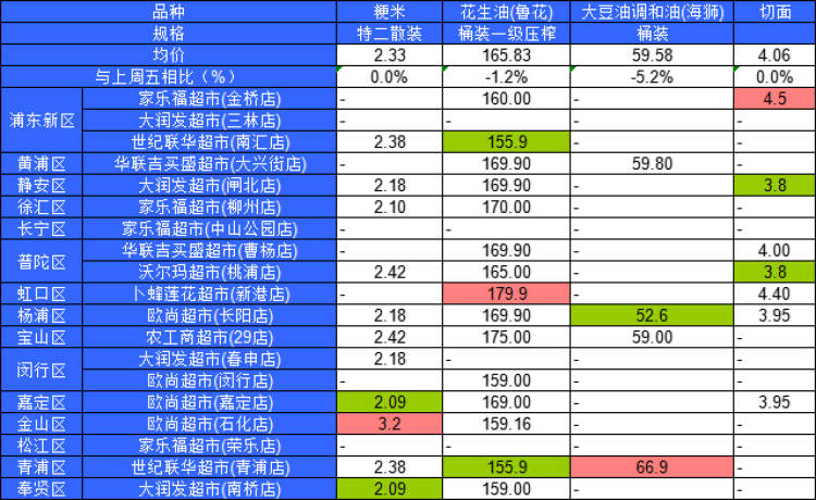 ■粉底标注代表该粮油品种在上述超市的最高价;绿底标注代表该粮油品种在上述超市的最低价