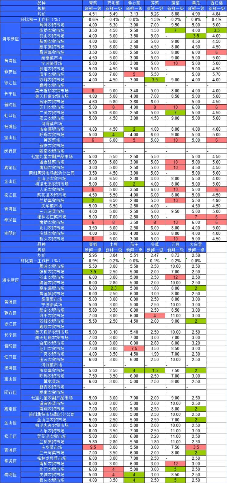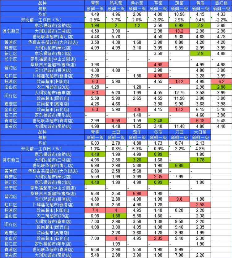 ■粉底标注代表该蔬菜品种在上述农贸市场或超市的最高价;绿底标注代表该蔬菜品种在上述农贸市场或超市的最低价