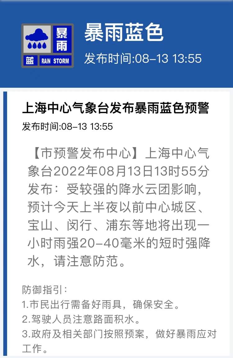 上海集齐“橙、黄、蓝”三色预警,高温、雷电、大风、暴雨都在路上了 周到君 2022-8-13 来源:周到上海 上海中心气象台2022年08月13日13时55分发布:受较强的降水云团影响,预计今天上半夜以前中心城区、宝山、闵行、浦东等地将出现一小时雨强20-40毫米的短时强降水,请注意防范。 防御指引: 1.市民出行需备好雨具,确保安全。 2.驾驶人员注意路面积水。 3.政府及相关部门按照预案,做好暴雨应对工作。 此前,高温橙色预警、雷电黄色预警、大风黄色预警已发布。 来源:周到上海 作者:周到君 赞一个 (0)