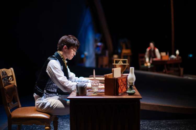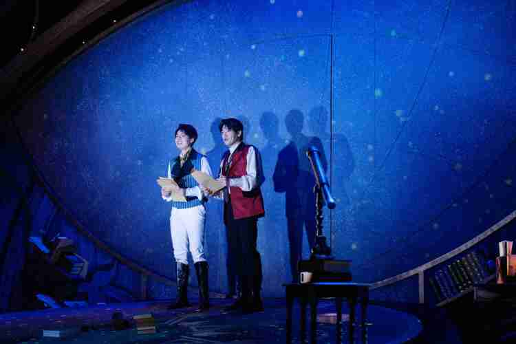 但音乐剧《星际信使》却营造出了两人似是在梦想的宇宙中与对方交谈的场景。如果把整体空间看作一个完整的宇宙,那么倾斜舞台区域被灵活运用的多媒体视频则好比两人一起向外眺望的窗户——这也是两人分享各自观察与思考的空间所在。