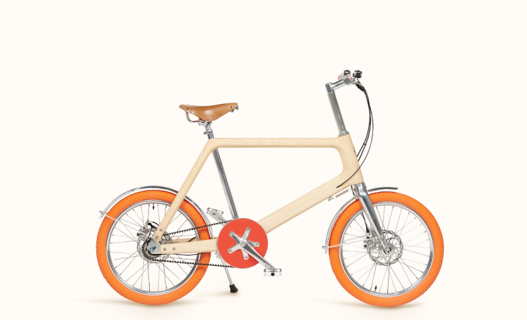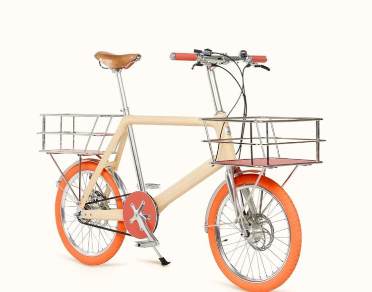 从外观看,车身采用了爱马仕经典的橙白配色,车身材质采用白蜡木、铝和Spad皮革打造,把手及坐垫支架处配有车灯。细节方面,前侧饰有系列标识上釉徽章,坐垫处标有“Hermes Paris”烫印字样,单车前后装配篮子。这款单车的设计灵感源自日式便携单车,轻盈时尚、线条简约。