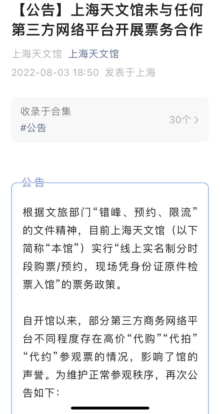 第三方加价销售天文馆门票的行为,也引起了天文馆的注意。8月3日,天文馆在其官方微信上发布了一则公告:上海天文馆从未与任何第三方网络平台开展票务合作,部分第三方商务网络平台不同程度存在高价“代购”“代拍”“代约”参观票的情况,影响了声誉。天文馆强调,对于未经授权的第三方网络平台、线下机构或个人以所谓“代购”“代拍”“代约”等方式加价售卖参观票的行为,涉嫌侵犯馆方合法权益或构成违法者,将保留向其追究相应法律责任及向有关执法部门进行举报的权利。