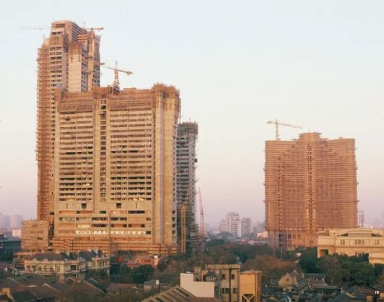 建设中的上海商城以及锦沧文华酒店(图中右边建筑)(陆杰拍摄, 1989年左右)