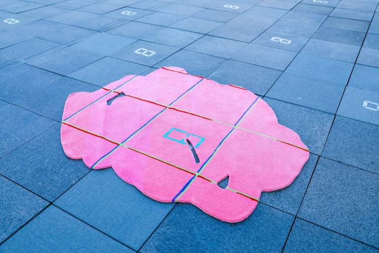 在复星艺术中心的天台咖啡厅一角及天台地面上,刘毅结合想象与现实进行的写生绘画在原地被如“实”还原,贯穿艺术家标志性荧光色彩(同时也是电子屏幕中最为常见的色彩)的“虚空间”与真实空间相重叠,诞生于电子屏幕的笔触被赋予绒面地毯的温暖质感。