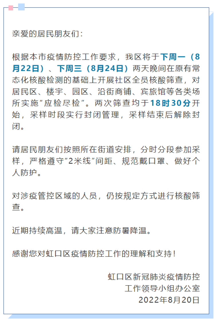 上海虹口今明全员核酸 周到君 2022-8-21 来源:周到上海 上海虹口发布告居民书,将于下周一(8月22日)、下周三(8月24日)两天晚间,在原有常态化核酸检测的基础上开展社区全员核酸筛查。 来源:周到上海 作者:周到君 赞一个 (0)