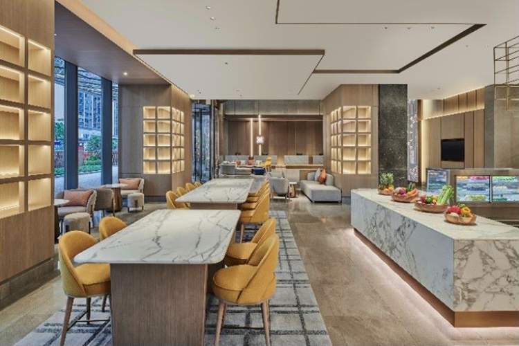 曾经在坪效比打分中并不理想的大堂,3.0版的希尔顿花园对此做了很大的调整,以深圳光明希尔顿花园酒店为例,将花荟·品吧打造为承载了社交、早餐、工作区等复合型功能的公区,模糊了空间的界限,不仅提升了坪效比,也成了年轻客群钟爱的区域,挖潜品牌的年轻客群。
