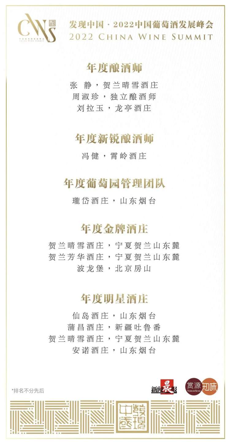 中国精品酒庄的庄主和葡萄酒行业内外的领军人物参加的中国葡萄酒发展峰会颁奖典礼晚宴上,揭晓了“年度明星酒庄”、“年度葡萄园管理团队奖”、“年度新锐酿酒师”、“年度酿酒师”等奖项;峰会组委会还通过专业评比,从参赛地众多酒样中,经评审主席伊安·达加塔大师,和由业内葡萄酒专家及知名侍酒师组成的品评小组,通过非常严格的盲品品鉴打分,和严谨细致的讨论合议,最终从全部参选酒款样品中,选出品质表现格外出众,同时也能够展现产区风土特色的酒款