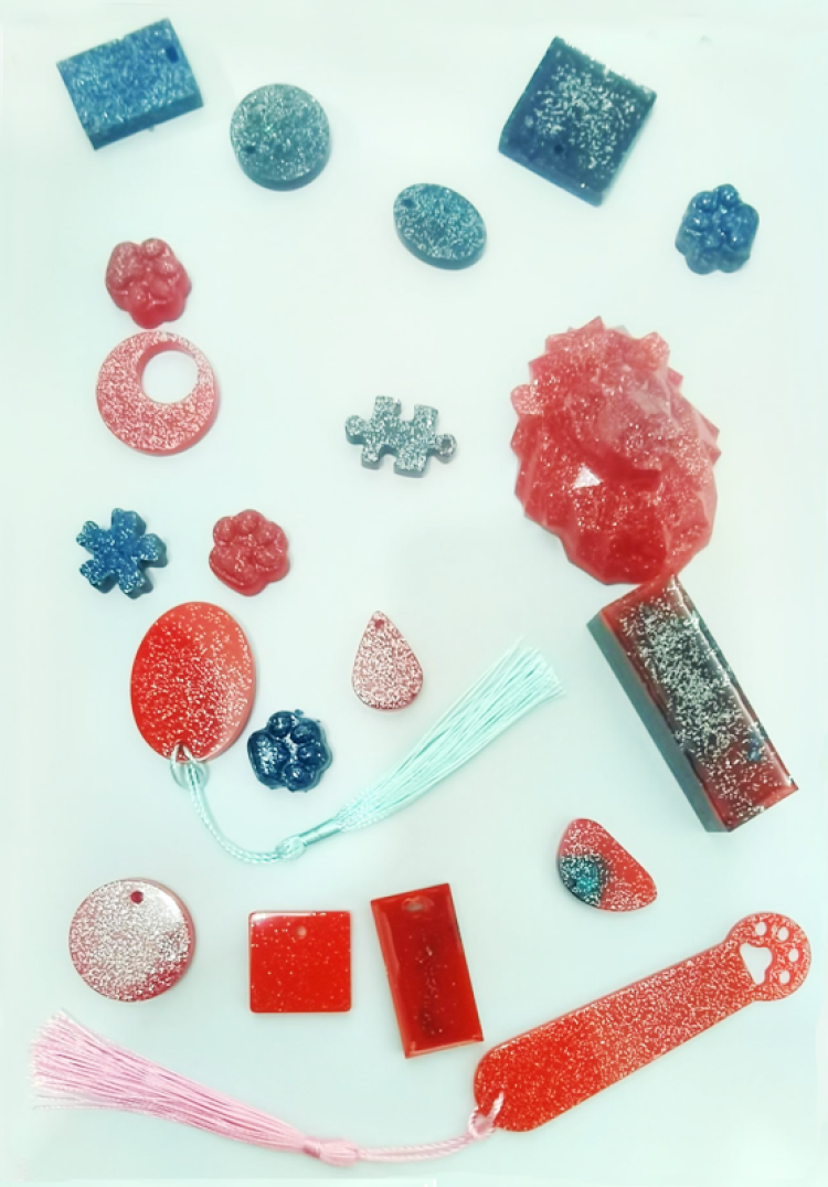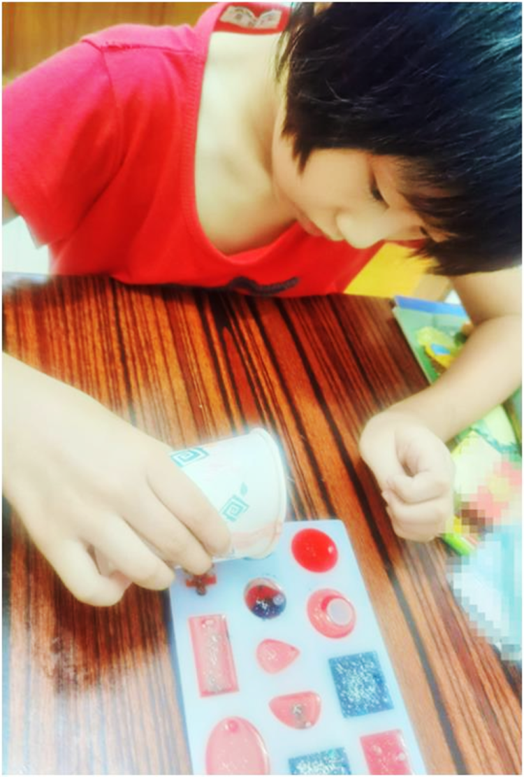 “做之前要先戴好手套,将滴胶材料里的,将A胶和B胶按照3:1的比例混合在杯中,加入色素,需要一直搅拌到气泡才行。”上海民办行知二中实验学校的李梦涵同学说,等这一环节完成,才能将混合好的滴胶倒入模具,再静置24小时,一个完美的滴胶作品才算完成,真不容易啊!