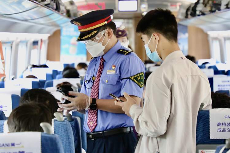 列车工作人员为乘客办理补票手续