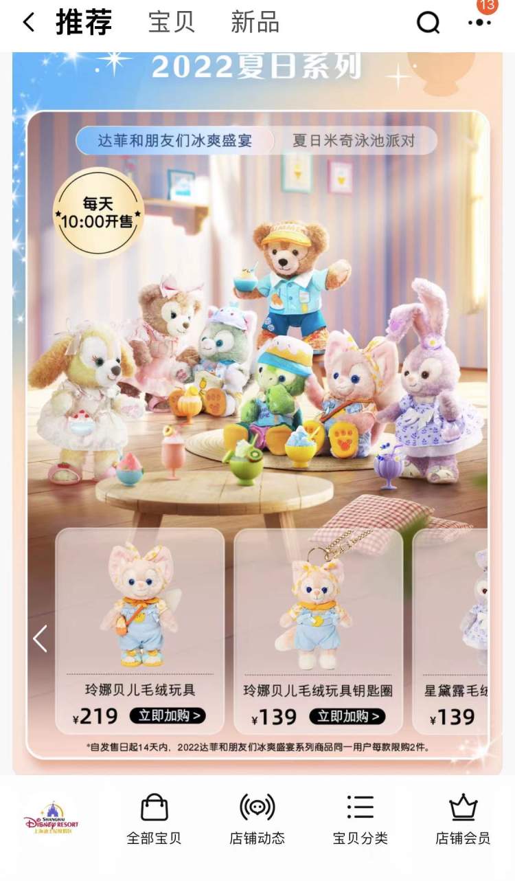 上海迪士尼乐园天猫官方旗舰店于今年8月10日起试运营,商品从最初仅几款开始不断丰富,店铺粉丝数目前已突破10万。此次“2022达菲和朋友们冰爽盛宴”系列商品是从昨天上午10点正式开售的。