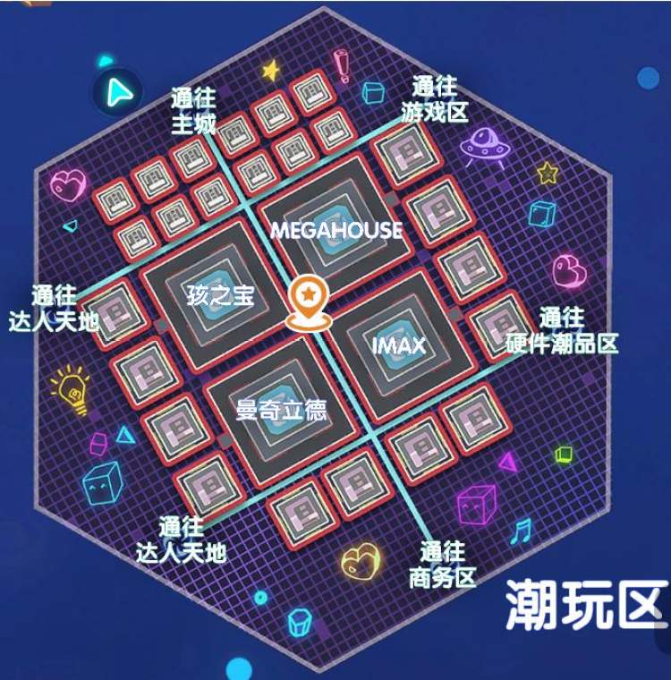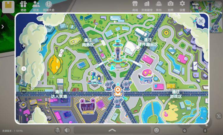 主城区有华丽建筑MetaCon会议中心、LiveHouse、灵境藏馆、逛展设施飞天大炮、传送门等功能。