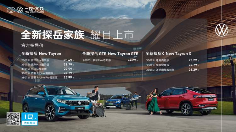 进阶,高能,智慧。一汽-大众全新探岳家族正式上市,包括“进阶高能智慧SUV”全新探岳、Coupe溜背造型全新探岳X以及插电混动全新探岳 GTE,提供1.4T、2.0T标准功率、2.0T高功率、插电混动共9款车型,官方指导价格区间为20.49万-26.29万元。
