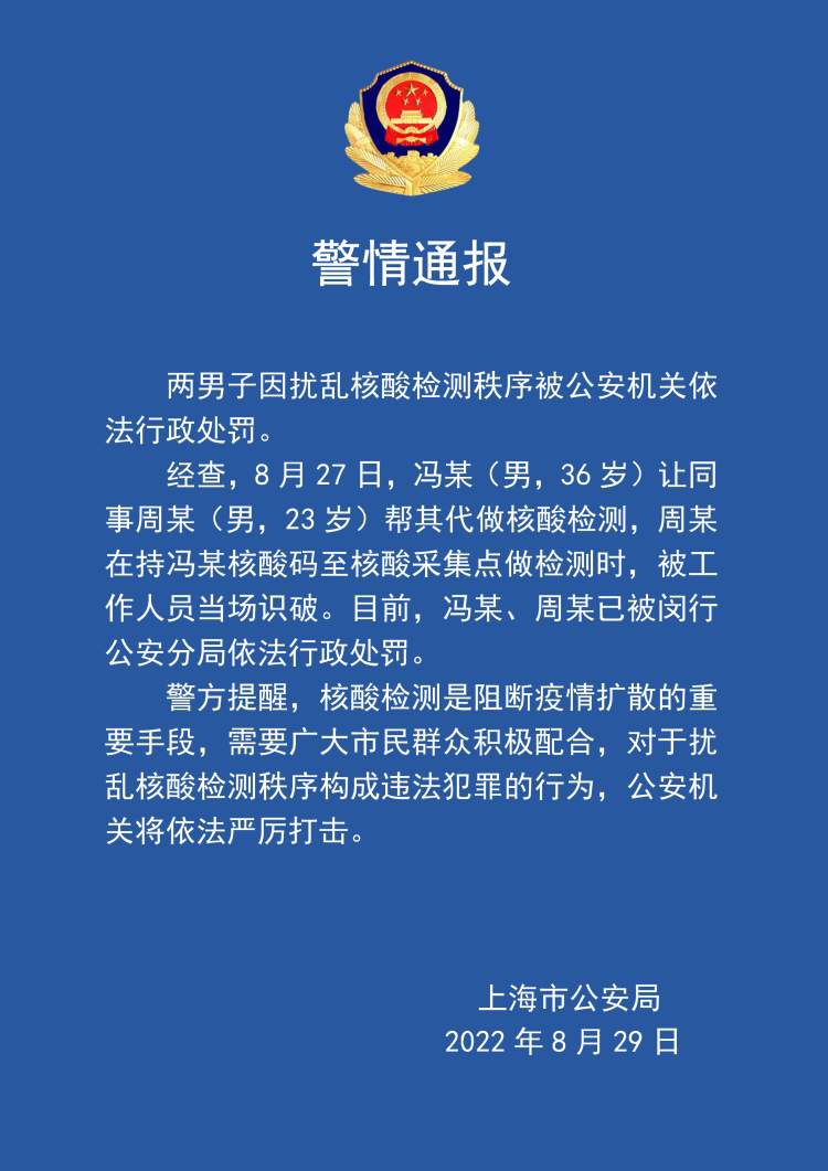 男子找同事代做核酸检测,两人双双被行政处罚 陈泉 2022-8-29 来源:周到上海 两男子因扰乱核酸检测秩序被公安机关依法行政处罚。 经查,8月27日,冯某(男,36岁)让同事周某(男,23岁)帮其代做核酸检测,周某在持冯某核酸码至核酸采集点做检测时,被工作人员当场识破。目前,冯某、周某已被闵行公安分局依法行政处罚。 警方提醒,核酸检测是阻断疫情扩散的重要手段,需要广大市民群众积极配合,对于扰乱核酸检测秩序构成违法犯罪的行为,公安机关将依法严厉打击。 来源:周到上海 作者:陈泉 赞一个 (0)