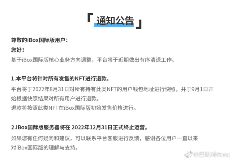 iBox国际版宣布停止运营,针对所发售NFT进行退款