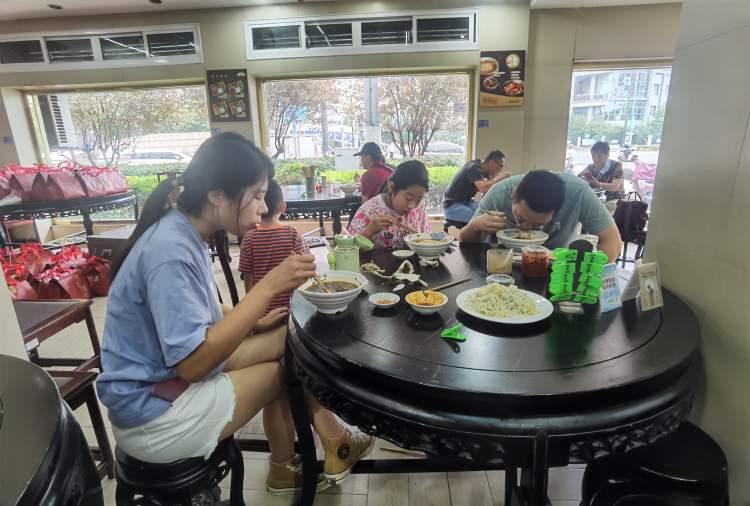 今天中午11点左右,记者来到店里,看见每张桌上都已经坐了顾客,有的在等餐,有的已经埋头大嚼。穿着白色工作服的服务员端着各种喷香的餐食穿行其间,给顾客们送上美味,或者收走已经吃空的盘盏。