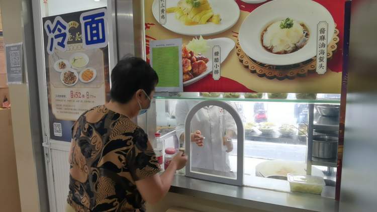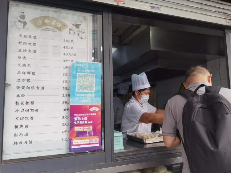 吃完了堂食,丁先生又来到店外的外卖窗口。这里的点心窗口销售各种包子、烧麦、花卷、鲜肉月饼等,前来购买的顾客络绎不绝。“买一点带回家,晚饭不用烧了,吃了清爽。再多的还可以当明天的早饭。”