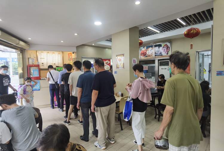 11点半左右,收银台前已经排出了长长的队伍,在店堂中央的走道中延伸开来。排队的顾客一边等待,一边四顾看看其他已入座的食客都在吃什么。一位阿伯还拿来了一口锅,等着装冷面。“我不在店里吃,打算买回去吃,自己带锅子来盛方便一点!”